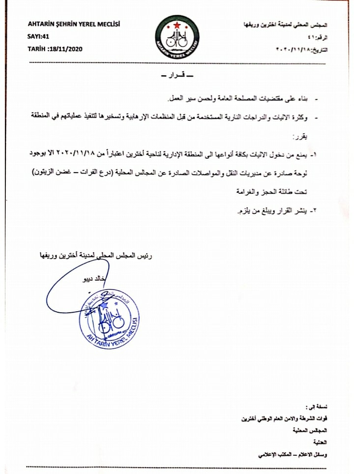 تزامناً مع ذلك، أصدر المجلس المحلي لمدينة أخترين قراراً، اليوم، يقضي بمنع دخول الآليات بكافة أنواعها دون وجود لوحة صادرة عن مديريات النقل والمواصلات في منطقتي “درع الفرات” و”غصن الزيتون”، تحت طائلة الحجز والغرامة.