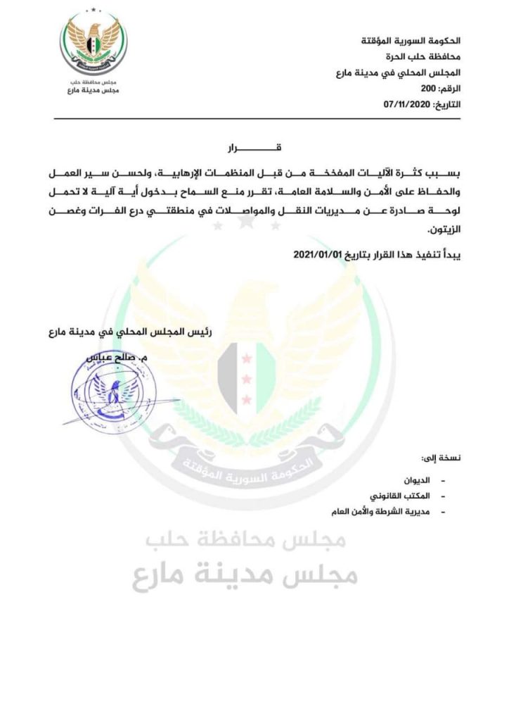 وقال المجلس في بيان له: “تقرر منع السماح بدخول أية آلية لا تحمل لوحة صادرة عن مديريات النقل والمواصلات في منطقتي درع الفرات وغصن الزيتون”.