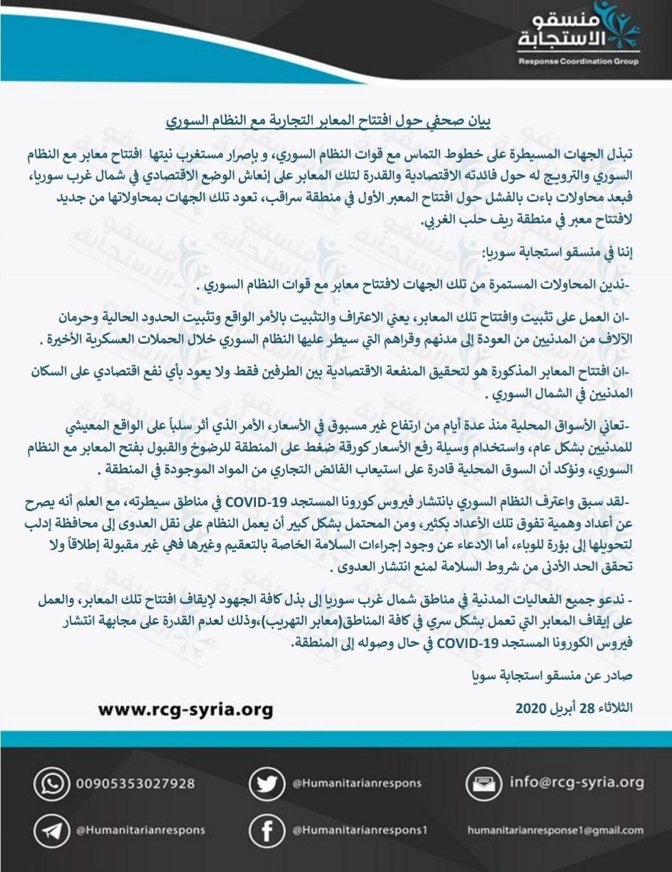 فريق “منسقو استجابة سوريا” أصدر بياناً، اليوم الثلاثاء، أدان فيه محاولة “تحرير الشام” فتح معبر مع النظام، مشيراً إلى أن افتتاح المعبر يحقق فائدة اقتصادية للطرفين، ولا يعود بأي نفع اقتصادي على السكان المدنيين في الشمال السوري.