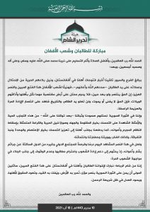 ووصفت الهيئة، في بيان لها سيطرة طالبان بـ”الفتوحات”، وقالت “ببالغ الفرح والسرور تلقينا أخبار فتوحات أهلنا في أفغانستان، فهنيئاً لشعب الأفغان هذه الفتح المبين والنصر العزيز”.