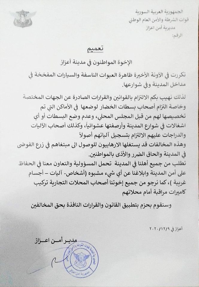 مجلس مارع المحلي بريف حلب، أصدر أيضاً قراراً، منتصف نوفمبر/ تشرين الثاني الماضي، منع بموجبه دخول أي آلية لا تحمل لوحة مسجلة في ريف حلب، مشيراً إلى أن القرار يصب في إطار ضبط المنطقة أمنياً عقب كثرة الآليات والدراجات النارية المفخخة.