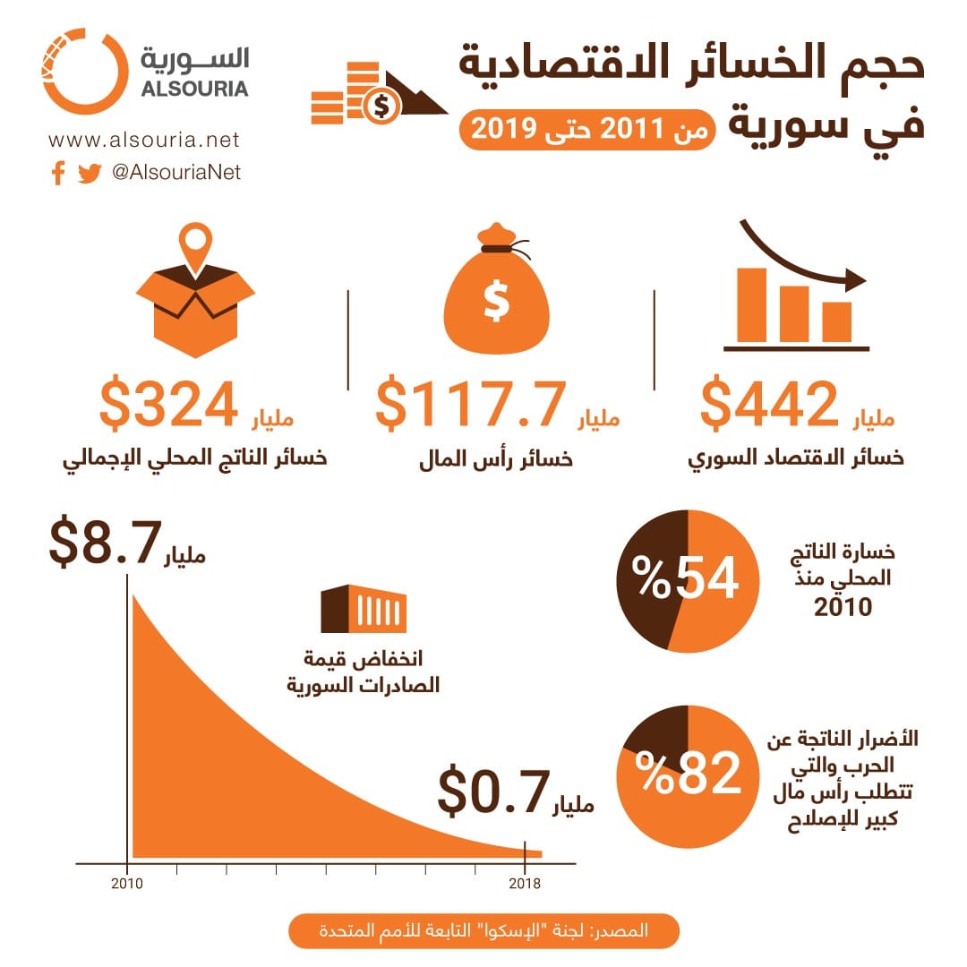 وكانت اللجنة الاقتصادية والاجتماعية (الإسكوا)، التابعة للأمم المتحدة، قدّرت حجم الخسائر الاقتصادية في سورية بـ 442 مليار دولار أمريكي، بعد 8 سنوات من الحرب.