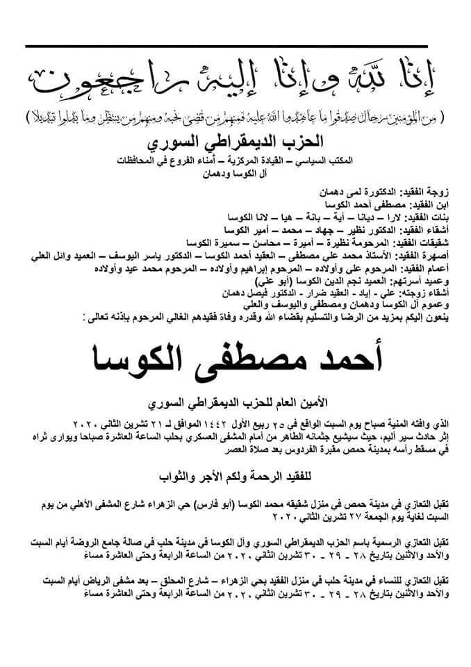 ونعى الحزب عبر معرفاته الرسمية في “فيس بوك” “الكوسا”، قائلاً إنه قضى “إثر حادث سير أليم”، مضيفاً أنه سيشيع من أمام المشفى العسكري في حلب، وسيدفن في مدينة حمص مسقط رأسه.