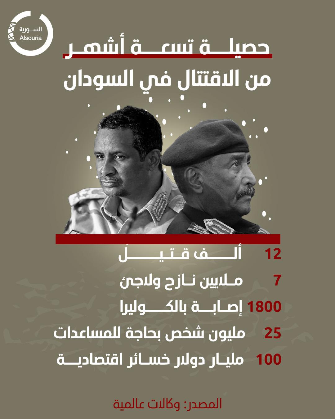 آلاف القتلى وملايين المهجرين كانوا حصيلة الاقتتال الحاصل في السودان منذ نحو 9 أشهر، بين الجيش الحكومي بقيادة عبد الفتاح البرهان، وقوات “الدعم السريع” التي يتزعمها محمد حمدان دقلو، وسط عجزٍ دولي عن حل عقدة هذه البقعة من الجغرافية الإفريقية، وإقرارٍ أممي بخروج الأوضاع الإنسانية عن السيطرة.