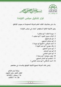 وحسب بيان صادر عن الحركة، اليوم الأربعاء، أعلن القائد العام للحركة، عامر الشيخ، تشكيل مجلس قيادة جديد، بناء على الصلاحيات الممنوحة له بموجب الاتفاق بين الأطراف المتنازعة.