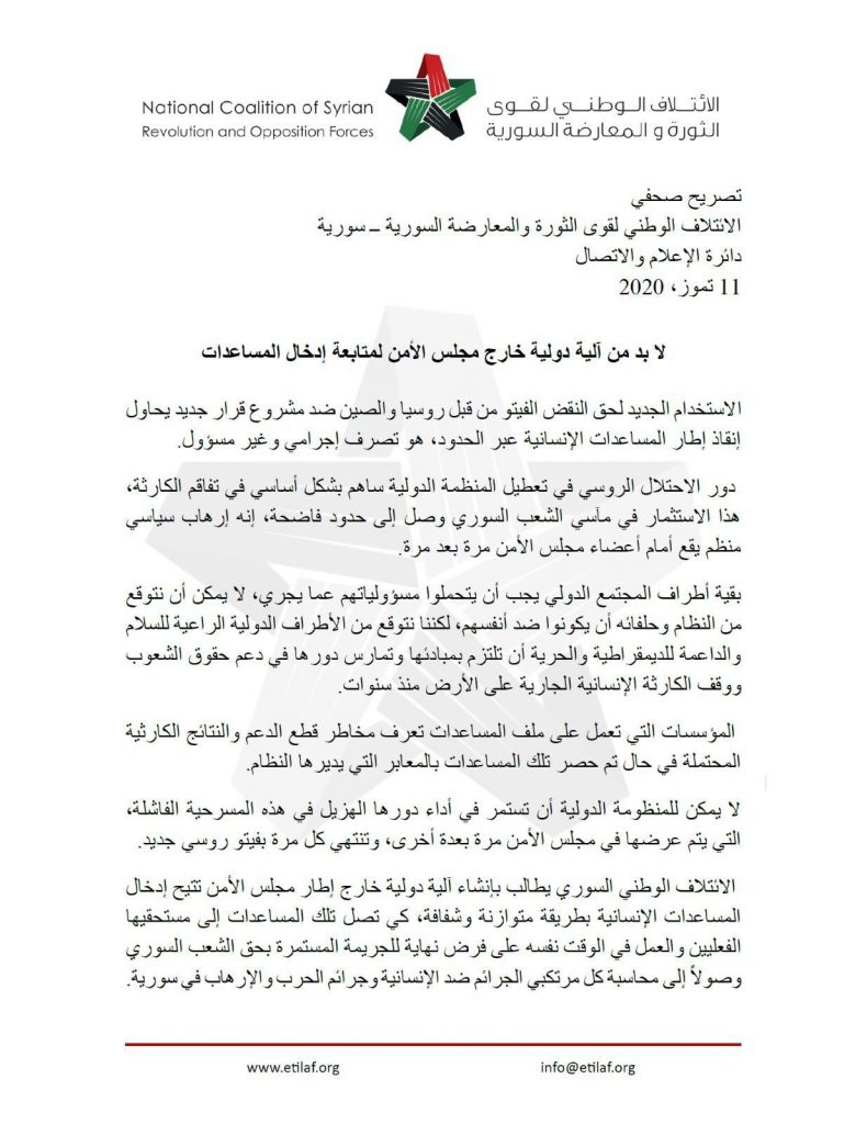 ونشر “الائتلاف” بياناً عبر موقعه اليوم السبت، طالب فيه بإنشاء آلية دولية خارج إطار مجلس الأمن، تتيح إدخال المساعدات بطريقة “متوازنة وشفافة”.