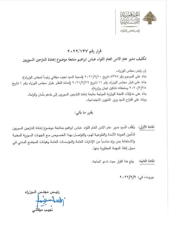 أصدر رئيس حكومة تصريف الأعمال اللبنانية، نجيب ميقاتي قراراً قضى بتكليف المدير العام للأمن العام، اللواء عباس ابراهيم بمتابعة موضوع “إعادة السوريين”.