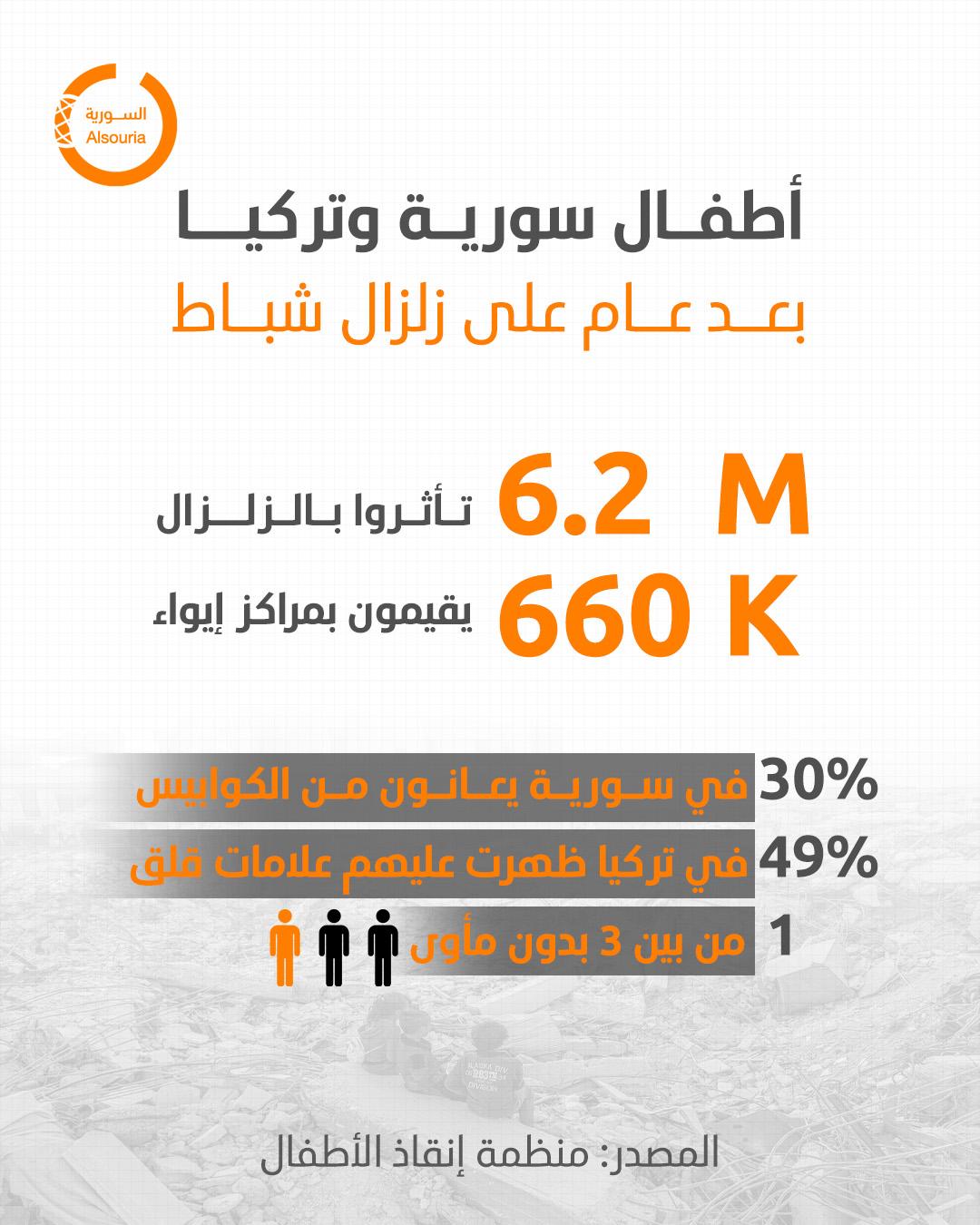 من جانبها، قالت منظمة “أنقذوا الأطفال” إن تداعيات الزلزال لا تزال مستمرة لدى ملايين الأطفال في سورية وتركيا، حيث يعانون من مشاكل في الصحة العقلية.