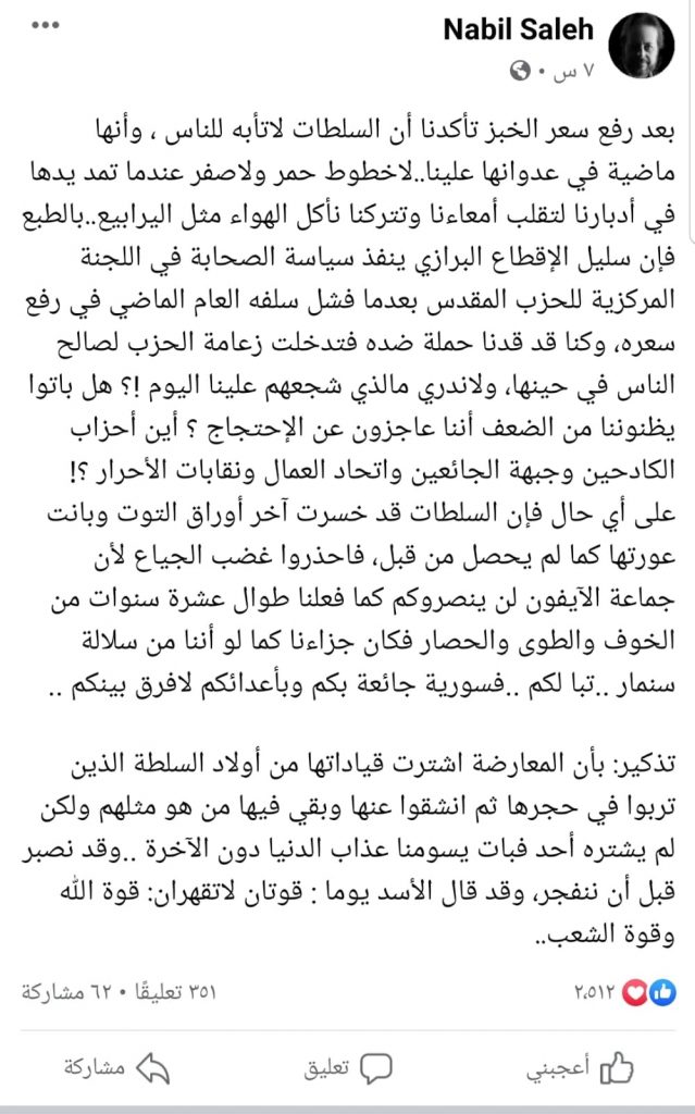 وحذر نبيل صالح من “غضب الجياع”، موجهاً كلامه لحكومة الأسد:” تباً لكم فسورية جائعة بكم وبأعدائكم لافرق بينكم”.