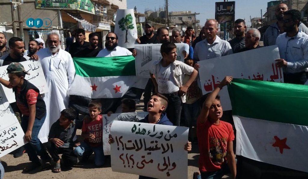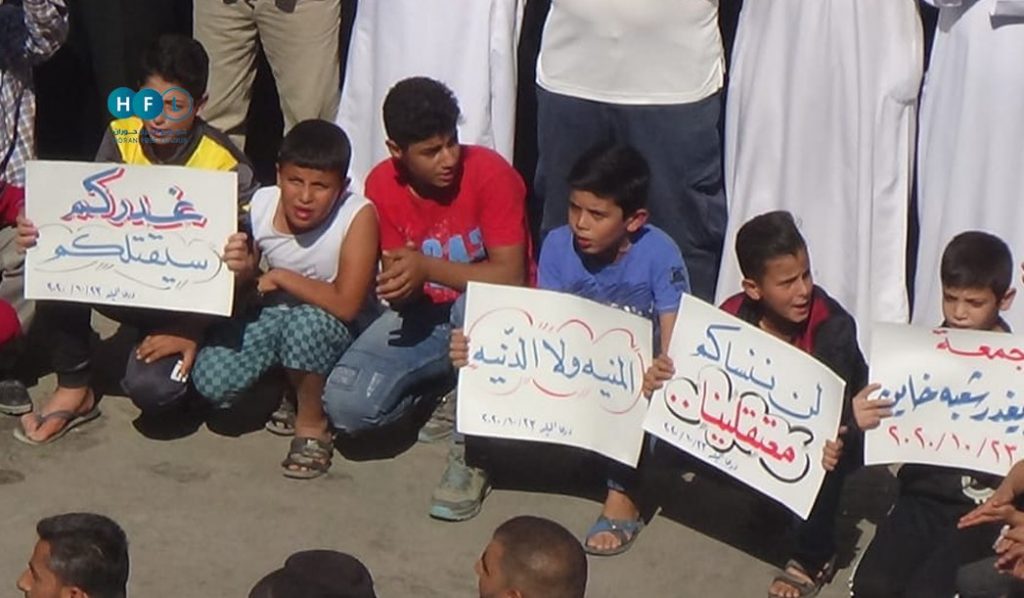 ونشرت شبكات محلية من درعا، اليوم، صوراً للمظاهرات، وتركّزت في مدينة طفس بالريف الغربي ومدينة الحراك، إلى جانب أحياء درعا البلد.
