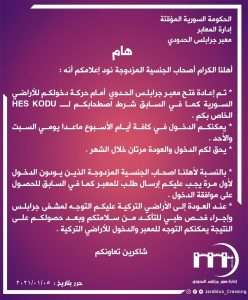 وتزامن ذلك مع إصدار معبر جرابلس في ريف حلب والحدودي مع تركيا بياناً، أكد فيه السماح لأصحاب “الجنسية المزدوجة” بالدخول من تركيا إلى داخل الأراضي السورية.