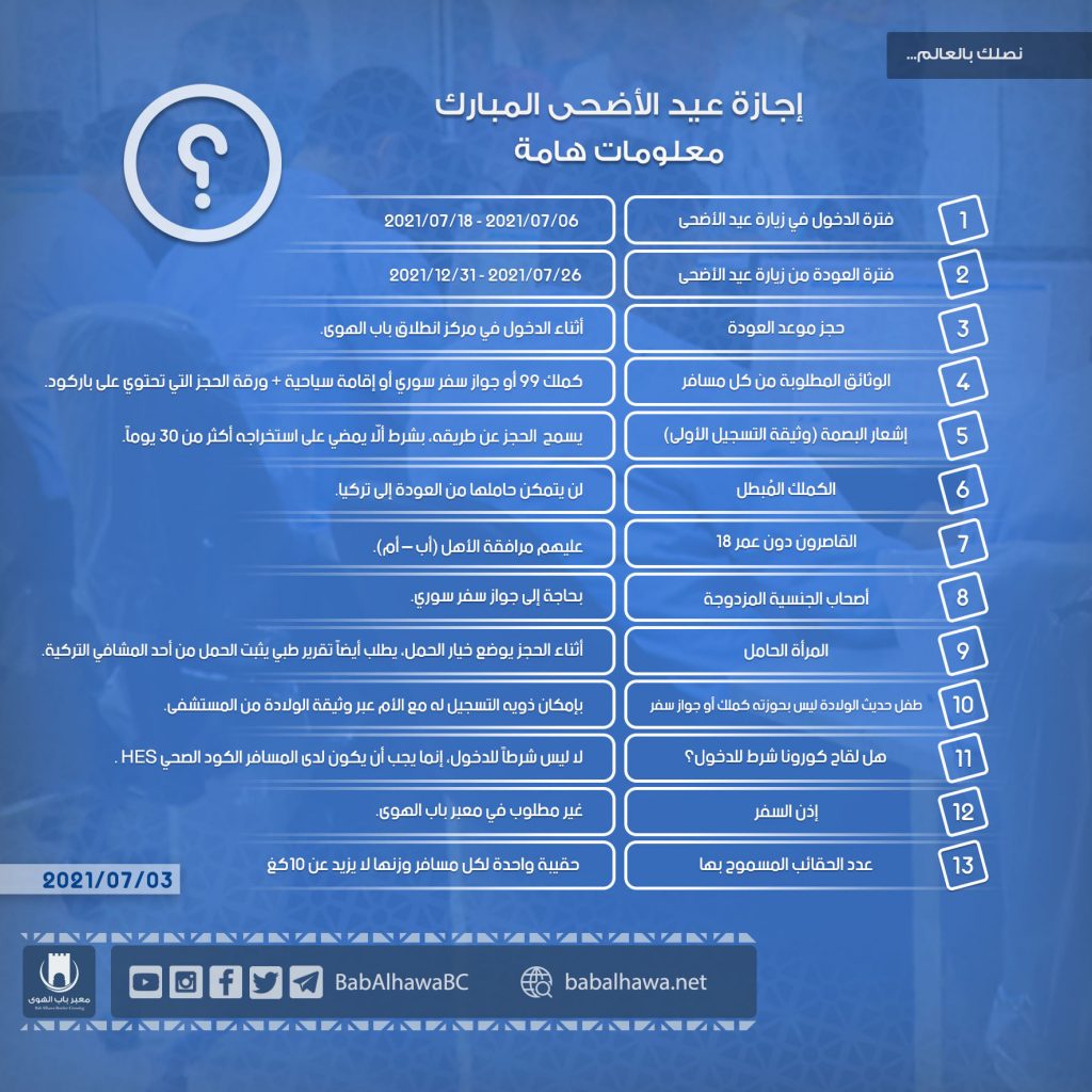وبحسب ما قالت مصادر إعلامية من ريف حلب الشمالي فإن الشروط والتعليمات التي نشرها “باب السلامة” تنطبق أيضاً على معبري “تل أبيض” و”جرابلس”، من حيث موعد الدخول والعودة، وبخصوص الأشخاص الذين تشملهم “إجازة العيد”.