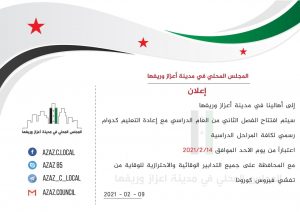 أعلن المجلس المحلي لمدينة اعزاز، في ريف حلب الشمالي، استئناف العملية التعليمة وجهاً لوجه في المدارس، بعد التنسيق مع مديرية التربية في ولاية كلس التركية.