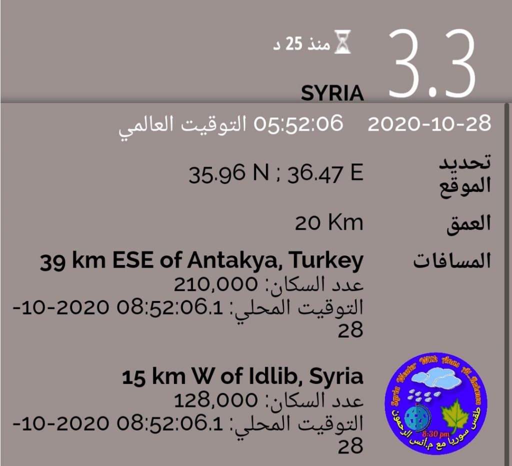 وقال خبير الطقس والزلازل أنس الرحمون عبر صفحته في “فيس بوك” إن ماشعر به سكان شمال سورية، وتحديداً إدلب و حلب و كذلك الساحل مع مدينة أنطاكيا التركية، هو هزة أرضية قوية نسبياً.
