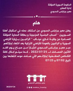 أعلنت إدارة معبر جرابلس الحدودي بين سورية وتركيا، عن استئناف العمل أمام السوريين الحاصلين على بطاقة الحماية المؤقتة” (كملك)، الصادرة عن ولاية غازي عينتاب، ومن حملة الجنسية التركية.