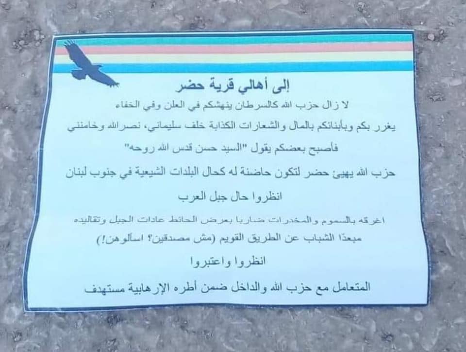 وجاء في المنشورات التي نشرتها شبكات محلية من حضر، اليوم السبت: “لا زال حزب الله كالسرطان ينهشكم في العلن وفي الخفاء، ويغرر بكم وبأبنائكم بالمال والشعارات الكاذبة خلف سليماني. نصر الله وخامنئي”.