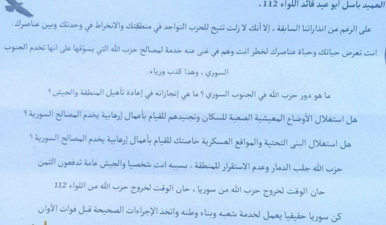 ومنذ يومين ذكرت وسائل إعلام عبرية أن الجيش الإسرائيلي ألقى منشورات تحذيرية على عدة مناطق جنوب سورية، طالبت بطرد قوات “حزب الله”، وتضمنت تهديدات لقائد أحد ألوية قوات الأسد.