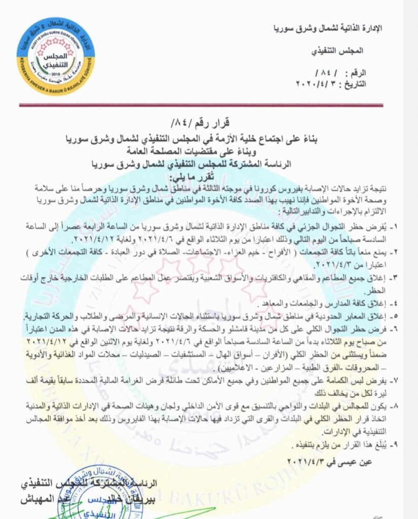 ونشرت “الإدارة الذاتية” قراراً، اليوم الاثنين قالت فيه إن الحظر الكلي يشمل مدن: القامشلي، الحسكة، الرقة، على أن يستمر لأسبوع.