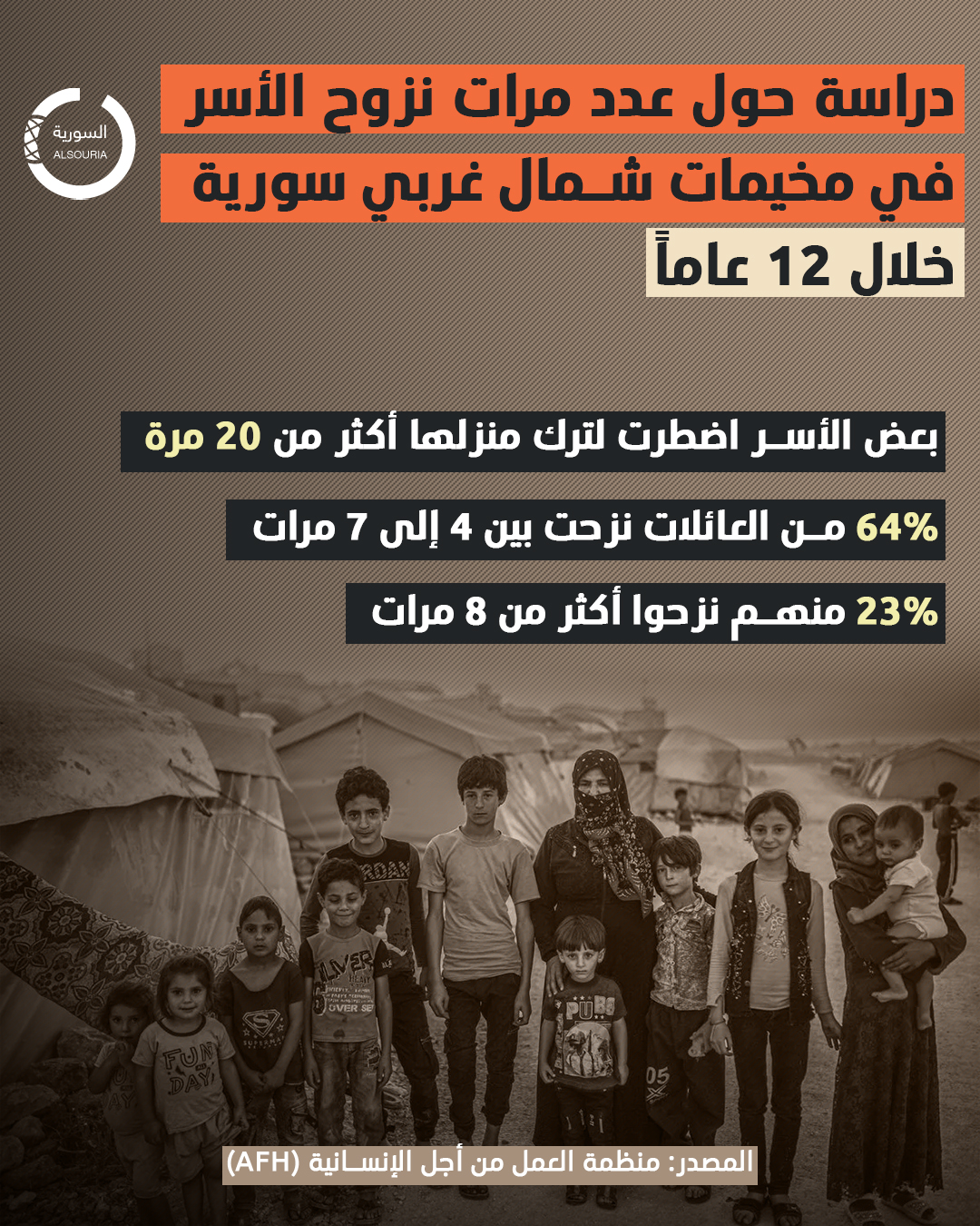 نزوح متكرر للعائلات في مخيمات شمال غربي سورية معظمها بين 4 إلى 6 مرات.. في 16/03/2023 مشاركة المصدر السورية.نت إدلبتكرار النزوحريف حلبسورياشمال غربي سورياعائلاتمخيماتنزوح مشاركة
