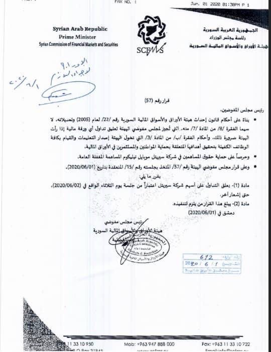 ونشرت “هيئة الأوراق والأسواق المالية السورية” قراراً اليوم الاثنين، قالت فيه إن مجلس المفوضين فيها قرر تعليق التداول على أسهم “سيريتل”، اعتباراً من جلسة يوم غد الثلاثاء 2 من حزيران.