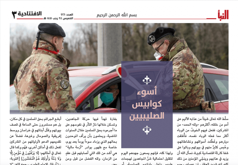 وجاءت الافتتاحية، التي نشرت في شهر آذار الماضي، تحت عنوان “أسوأ كوابيس الصليبيين”، وتحدثت بشماتة عن أثر “كورونا” على “الأعداء الكثر”، الذين يطلق عليهم تنظيم الدولة اسماً جماعياً هو “المشركون”.