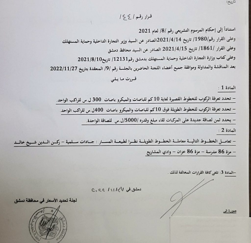 تزامناً مع ذلك، أصدرت محافظة دمشق قراراً أعلنت خلاله رفع أجور النقل العام للباصات والميكرو باصات بنسبة 100%.