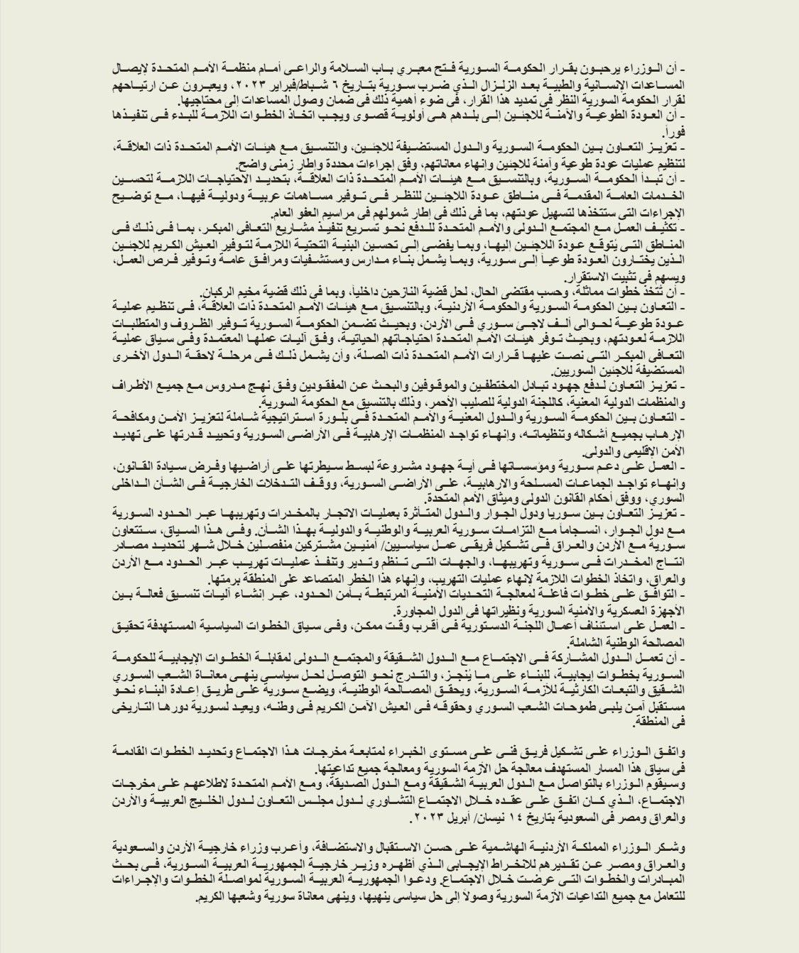 وتحدث البند الثاني حول ضرورة “الحرص على إطلاق دور عربي قيادي في جهود حل الأزمة السورية، يعالج جميع تبعات الأزمة الإنسانية والأمنية والسياسية على سوريا وشعبها، ومعالجة انعكاسات هذه الأزمة على دول الجوار والمنطقة والعالم، خصوصاً عبء اللجوء، وخطر الإرهاب وخطر تهريب المخدرات”.