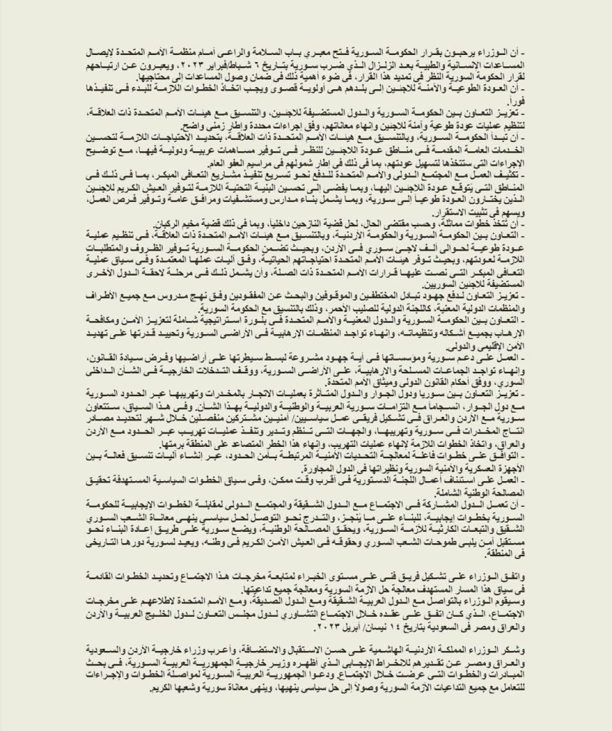 كما أكد على “الترحيب باستعداد الجمهورية العربية السورية التعاون مع الدول العربية لتطبيق مخرجات البيانات العربية ذات الصلة، وضرورة تنفيذ الالتزامات والتوافقات التي تم التوصل إليها في اجتماع عمان، وكذلك اعتماد الآليات اللازمة لتفعيل الدور العربي”.