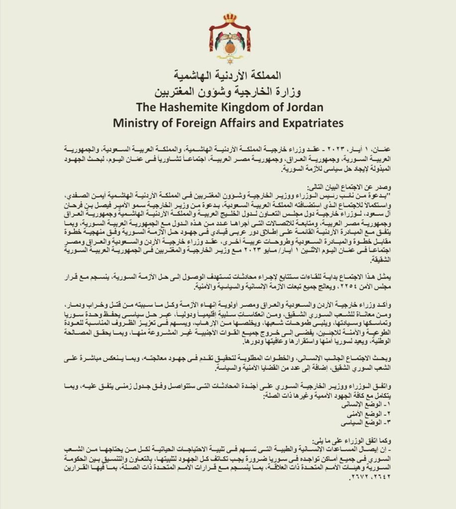 وضم الاجتماع وزراء خارجية النظام ومصر والعراق والسعودية والأردن، وصدر عقبه ما بات يُعرف بـ“بيان عمان”، الذي حدد خطوات لحل “الأزمة السورية” بموافقة النظام.