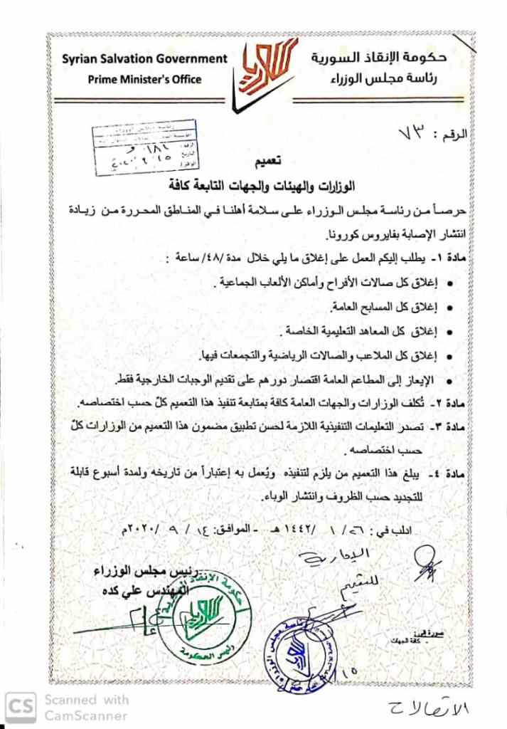 أعلنت “حكومة الإنقاذ”، العاملة شمال غربي سورية، حزمة إجراءات جديدة، تزامناً مع ارتفاع وتيرة الإصابات بفيروس “كورونا” في الشمال السوري.